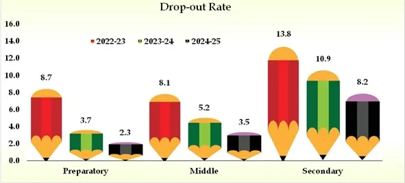 2023-24, 2022-23 കാലയളവുകളുമായി താരതമ്യപ്പെടുത്തുമ്പോൾ 2024-25 ലെ കൊഴിഞ്ഞുപോക്ക് നിരക്കിന്റെ അടിസ്ഥാനവിവരങ്ങൾ, എല്ലാ വിദ്യാഭ്യാസ തലങ്ങളിലും ഗണ്യമായ പുരോഗതി കൈവരിച്ചിട്ടുണ്ട്. പ്രാരംഭഘട്ടത്തിൽ, മൊത്തം കൊഴിഞ്ഞുപോക്ക് നിരക്ക് 8.7 ശതമാനത്തിൽ നിന്ന് 2.3 ശതമാനമായി കുത്തനെ കുറഞ്ഞു.