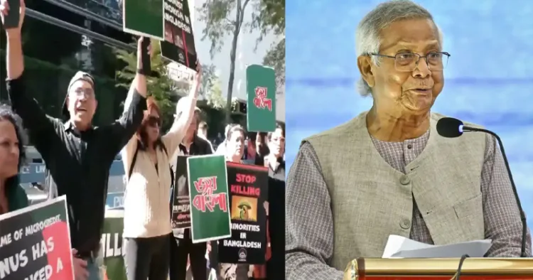 ബംഗ്ലാദേശിലെ ന്യൂനപക്ഷങ്ങളെ യൂനുസ് പീഡിപ്പിക്കുകയാണെന്ന് പ്രതിഷേധക്കാര്‍ ആരോപിച്ചു. യൂനുസ് പാകിസ്ഥാനിയാണ്, പാകിസ്ഥാനിലേക്ക് തന്നെ മടങ്ങിപ്പോവുക, ബംഗ്ലാദേശിലെ ന്യൂനപക്ഷങ്ങളെ കൊന്നൊടുക്കുന്നത് നിര്‍ത്തുക, ബംഗ്ലാദേശിലെ ഇസ്ലാമിക ഭീകരതയോട് വിട പറയുക എന്നിങ്ങനെയെഴുതിയ ബാനറുകളുമായാണ് പ്രതിഷേധക്കാര്‍ ഐക്യരാഷ്‌ട്രസഭക്ക് മുന്നില്‍ നിരന്നത്.