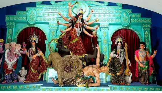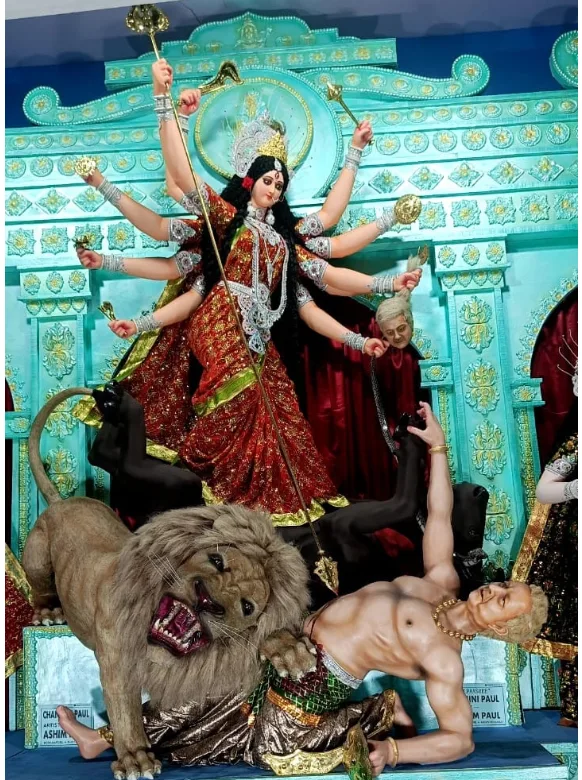കൊൽക്കൊത്ത: അമേരിക്കൻ പ്രസിഡന്റ് ട്രംപ് രക്തബീജാസുരനായി, പാകിസ്ഥാൻ പ്രധാനമന്ത്രി ഷെഹ്ബാസ് ഷെരീഫ് സുംഭാസുരനായി, ബംഗ്ലാദേശ് പ്രധാനമന്ത്രി മുഹമ്മദ് യൂനസ് മഹിഷാസുരനായി. ഭാരത ശക്തിയായി ദേവി ദുർഗ്ഗ, രാഷ്‌ട്രത്തിനെതിരുനിന്ന മൂന്നുപേരെയും വകവരുത്തി.