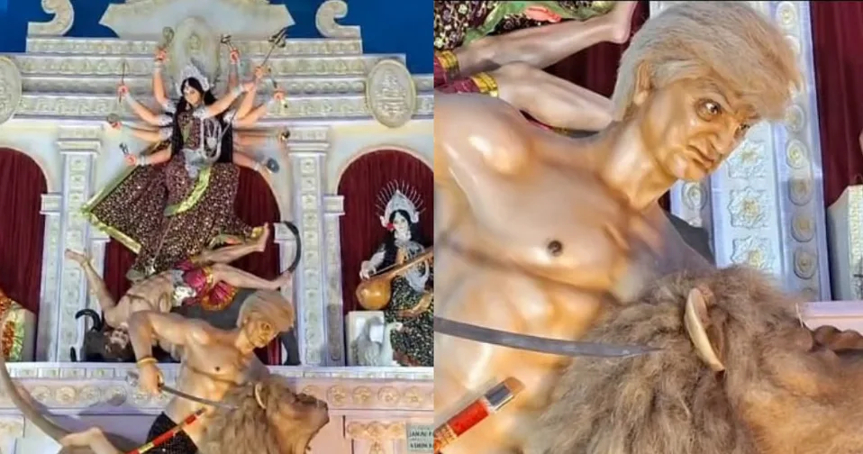 ഖഗ്ര ശ്മശാന ഘട്ട് ദുർഗാ പൂജ കമ്മിറ്റിയുടെ പന്തലിലായിരുന്നു, ഡൊണാൾഡ് ട്രംപിന്റെ മാതൃകയിൽ ഒരു രാക്ഷസനെ ചിത്രീകരിക്കുന്ന പ്രതിമ.