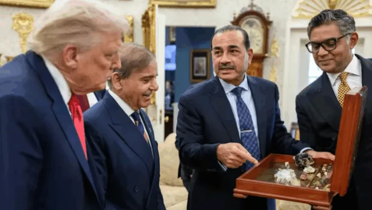 വൈറ്റ് ഹൗസ് അപൂർവ ജൈവ ധാതുക്കൾ എന്ന് വിശേഷിപ്പിച്ചവ നിരത്തിയ മരപ്പെട്ടി, മൂടി തുറന്നപ്പോൾ അതിലേക്ക് ഉറ്റുനോക്കുന്ന ഡൊണാൾഡ് ട്രംപിന്റെ ചിത്രം വൈറ്റ് ഹൗസ് പുറത്തുവിട്ടു. പാകിസ്ഥാൻ പ്രധാനമന്ത്രി ഷെഹ്ബാസ് ഷെരീഫ് പുഞ്ചിരിക്കുമ്പോൾ, പാക് കരസേനാ മേധാവി അസിം മുനീർ അതേക്കുറിച്ച് വിവരിക്കുന്നതാണ് ചിത്രം. യുഎസ് പ്രസിഡന്റ് കണ്ണുതള്ളി അതിലേക്ക് നോക്കുന്നതായി ഫോട്ടോയിൽ കാണാം. ഓവൽ ഓഫീസിലെ ഒരു അടച്ചിട്ട വാതിൽ പാക്-യുഎസ് നേതാക്കളു െമീറ്റിംഗ് ചേർന്നതിനും ഒരു യുഎസ് ലോഹക്കമ്പനി പാകിസ്ഥാനുമായി 500 മില്യൺ ഡോളറിന്റെ നിക്ഷേപ കരാറിൽ ഒപ്പുവച്ചതിനും ആഴ്ചകൾക്കുള്ളിലാണ് ഈ ഫോട്ടോ എടുത്ത അവസരം.