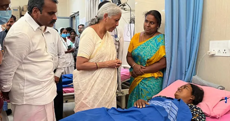 മരിച്ചവരുടെ ബന്ധുക്കൾക്കൊപ്പം ഏത് സമയത്തും കേന്ദ്രസർക്കാർ ഒപ്പമുണ്ടാകുമെന്നും കേന്ദ്ര ധനമന്ത്രി പറഞ്ഞു. രാവിലെ പതിനൊന്ന് മണിയോടെയാണ് നിർമല സീതാരാമനും എൽ മുരുഗനും കരൂരിലെത്തിയത്. അപകട സ്ഥലം സന്ദർശിച്ച ശേഷം ഇരുവരും കരൂർ മെഡിക്കൽ കോളേജിലെത്തി ചികിത്സയിൽ കഴിയുന്നവരെ കണ്ടു. തുടർന്ന് അപകടത്തിൽ മരിച്ചവരുടെ കുടുംബാംഗങ്ങളെ അവരുടെ വീടുകളിൽ പോയി കണ്ടു. അപകടത്തിൽ പരിക്കേറ്റവർക്ക് 50,000രൂപയും മരിച്ചവരുടെ കുടുംബങ്ങൾക്ക് രണ്ട് ലക്ഷം രൂപയും അനുവദിച്ചിരുന്നു.