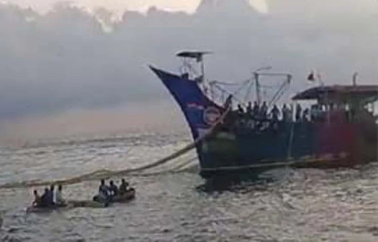 നിര്ത്തിയിട്ട് മീന് പിടിക്കുകയായിരുന്നുവെന്നും അപ്പോഴാണ് കപ്പല് വന്നിടിച്ചതെന്നും തൊഴിലാളികള് പറയുന്നു. പള്ളിത്തൊഴു സ്വദേശി സ്റ്റാലിന് എന്നയാളുടെ ‘പ്രത്യാശ’ എന്ന വള്ളമാണ് അപകടത്തില് പെട്ടത്.