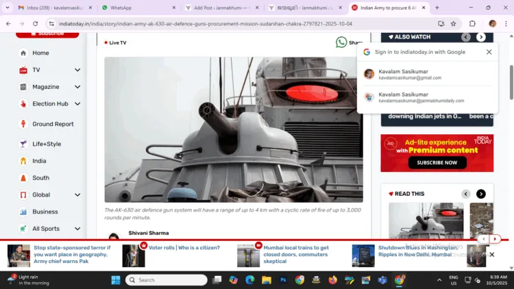 ന്യൂദൽഹി: പദ്ധതി പ്രഖ്യാപിച്ച് 50 ദിവസം കഴിഞ്ഞപ്പോൾ നടപടി; മോദി സർക്കാരിന്റെ രാജ്യ സുരക്ഷയിലും പ്രതിരോധത്തിലുമുള്ള ശ്രദ്ധയും സൂക്ഷ്മതയും അത്രയ്ക്കാണ്. ചെങ്കോട്ടയിൽ ഈ ആഗസ്ത് 15 നാണ് പ്രതിരോധത്തിന് മിഷൻ സുദർശനചക്ര പ്രഖ്യാപിച്ചത്. അതിന്റെ ഭാഗമായി ആറ് എകെ630 സൈന്യത്തിന് ലഭ്യമാക്കി. ഈ ആറ് 30 എംഎം തോക്കുകൾ സൈന്യത്തിന്റെ വ്യോമ കവചം ശക്തിപ്പെടുത്തും. ഓപ്പറേഷൻ സിന്ദൂരിൽ പാകിസ്ഥാൻ ലക്ഷ്യം വെച്ച അതിർത്തി പ്രദേശങ്ങളിലായിരിക്കും ഈ വ്യോമ പ്രതിരോധ തോക്കുകൾ വിന്യസിക്കുക.