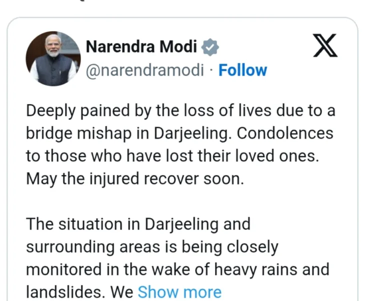 “ഡാർജിലിംഗിലെ പാലം അപകടത്തിൽ ഉണ്ടായ ജീവഹാനിയിൽ അഗാധമായ ദുഃഖം രേഖപ്പെടുത്തുന്നു. പ്രിയപ്പെട്ടവരെ നഷ്ടപ്പെട്ടവർക്ക് അനുശോചനം. പരിക്കേറ്റവർ ഉടൻ സുഖം പ്രാപിക്കട്ടെ.