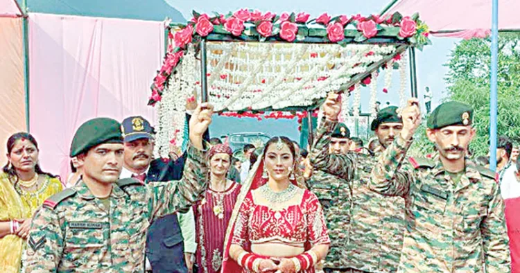 ഷിംല: രാജ്യത്തിനായി ജീവന് നല്കിയ സൈനികന്റെ സഹോദരിയുടെ വിവാഹം സഹോദരന്റെ സ്ഥാനത്തു നിന്ന് സൈന്യം നടത്തിക്കൊടുത്തു. ഹിമാചല് പ്രദേശിലെ സിര്മര് ജില്ലയിലെ ഭര്ലി സ്വദേശിയായ ആശിഷിന്റെ സഹോദരി ആരാധനയുടെ വിവാഹമാണ് സൈനികര് നേതൃത്വം നല്കി നടത്തിയത്. നഷ്ടമായ ഒരു സഹോദരന് പകരം രാജ്യം കാക്കുന്ന സൈനികരെല്ലാം ആരാധനയ്ക്ക് സഹോദരന്മാരായി. ഓരോ രാജ്യസ്നേഹിയുടേയും കണ്ണും മനസും നിറയ്ക്കുന്നതായിരുന്നു ഈ രംഗങ്ങള്. നിറകണ്ണുകളോടെയാണ് അതിഥികളും ചടങ്ങില് പങ്കെടുത്തത്.
