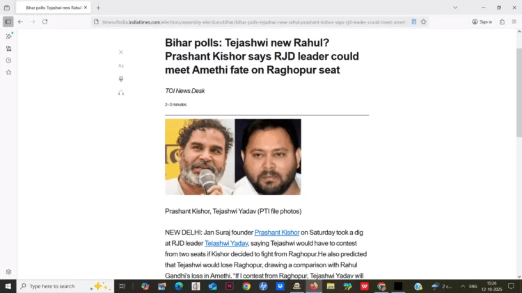 തേജസ്വി രണ്ട് സീറ്റുകളിൽ നിന്ന് മത്സരിച്ചേക്കാമെന്ന സമീപകാല റിപ്പോർട്ടുകൾക്കും കിഷോർ തന്നെ രാഘവ്പുരിൽ നിന്ന് മത്സരിച്ചേക്കുമെന്നും മറ്റുമുള്ള ചർച്ചകൾക്കിടയിലാണ് കിഷോറിന്റെ പരാമർശം. രാഘവ്പുർ വളരെക്കാലമായി ഒരു ആർജെഡി ശക്തികേന്ദ്രമാണ്. 2015 ലും 2020 ലും തേജസ്വി യാദവ് ഈ സീറ്റ് നേടി. നേരത്തെ അദ്ദേഹത്തിന്റെ പിതാവ് ലാലു പ്രസാദ് യാദവും അമ്മ റാബ്രി ദേവിയും ഈ സീറ്റിനെ പ്രതിനിധീകരിച്ചിരുന്നു. രാഘോപൂരിൽ പാർട്ടിയുടെ പ്രചാരണം ആരംഭിക്കുന്നതിന് മുമ്പ് പറ്റനയിൽ സംസാരിക്കുകയായിരുന്നു കിഷോർ. ”ഒരു കുടുംബത്തിന്റെ മേധാവിത്വം അവസാനിപ്പിക്കാൻ ആഗ്രഹിക്കുന്ന ജനങ്ങളിൽ നിന്ന് പ്രതികരണം തേടാനാണ് ഞാൻ രാഘവ്പുരിലേക്ക് പോകുന്നത്. രണ്ടാം തവണ എംഎൽഎയായ തേജസ്വി, നേരത്തെ ലാലു പ്രസാദ്, റാബ്രി ദേവി എന്നിവർ പ്രതിനിധീകരിക്കുന്ന മണ്ഡലമാണെങ്കിലും, മണ്ഡലത്തിൽ ഇപ്പോഴും അടിസ്ഥാന സൗകര്യങ്ങളില്ല,” അദ്ദേഹം ആരോപിച്ചു.