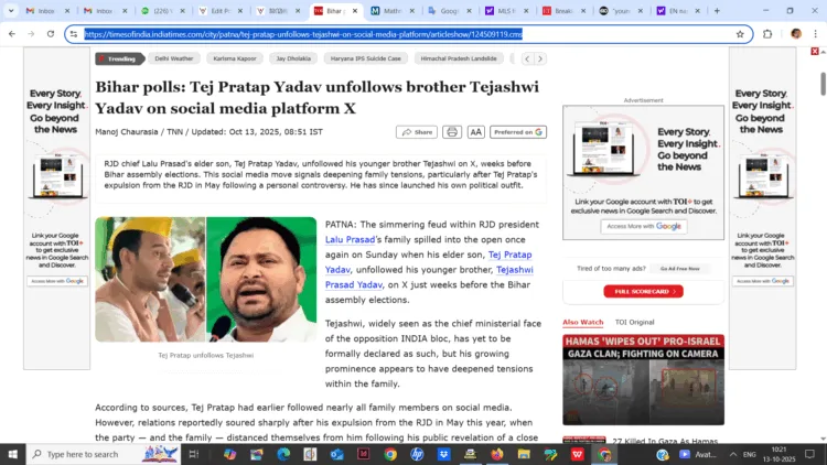 തെരഞ്ഞെടുപ്പിന്റെ ആദ്യഘട്ടം നാമനിർദ്ദേശപത്രിക സമർപ്പിക്കാൻ തുടങ്ങുന്നതിന് ഇനി നാലുദിവസമേ ഉള്ളു. അപ്പോഴാണ് ലല്ലുവിന്റെ മൂത്തമകന്റെ വെടി. ഇളയ അനുജൻ തേജസ്വിയോട് തേജ് പ്രതാപ് പറയാതെ പറഞ്ഞു, അനിയാ നിനക്ക് നിന്റെ വഴലി, ഞാൻ പിന്തുടരുന്നില്ല. അത് ‘പറഞ്ഞത്’ സാമൂഹ്യമാധ്യമമായ ‘എക്സ്’ വഴിയാണ്. തേജസ്വിയെ എക്സിൽ ഫോളോ ചെയ്യുന്നത് തേജ് പ്രതാപ് നിർത്തി.