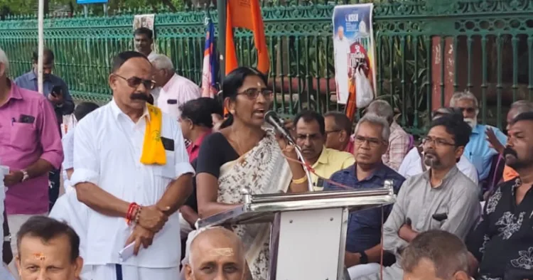 പന്തളംകൊട്ടാരം മുന് സെക്രട്ടറിയും ശബരിമല അയ്യപ്പസേവാസമാജം പ്രസിഡന്റുമായ നാരായണവര്മ്മ അധ്യക്ഷനായി. ഹിന്ദുഐക്യവേദി സംസ്ഥാന പ്രസിഡന്റ് ആര്.വി. ബാബു, വര്ക്കിംഗ് പ്രസിഡന്റ് വത്സന് തില്ലങ്കരി, വൈസ്പ്രസിഡന്റ് ഇ.എസ്.ബിജു, ക്ഷേത്രസംരക്ഷണസമിതി വൈസ്പ്രസിഡന്റ് ജി.കെ. സുരേഷ്ബാബു, ശബരിമല കര്മ്മസമിതി ജനറല് കണ്വീനര് എസ്.ജെ.ആര്. കുമാര്, കേരള ബ്രാഹ്മണസഭ സംസ്ഥാന പ്രസിഡന്റ് എച്ച്. ഗണേശ്, കെപിഎംഎസ് പ്രസിഡന്റ് പ്രസിഡന്റ്, വിശ്വകര്മ്മ ഐക്യവേദി ചെയര്മാന് ഡോ. രാധാകൃഷ്ണന്, വാണിയ സമുദായ സമിതി പ്രസിഡന്റ് അഡ്വ. ഷാജി പയനൂര്, ആള്കേരള ബ്രാഹ്മണസമാജം പ്രസിഡന്റ് ബിജു എന്. പൈ, ഐക്യ മലയരയ മഹാസംഘ് വൈസ് പ്രസിഡന്റ് സുബിന് വി. അനിരുദ്ധന്, വിരാട് സമസ്ത വിശ്വകര്മ്മസഭ പ്രസിഡന്റ് വിഷ്ണുഹരി, കേരള ഗണക കണിശസഭ പ്രസിഡന്റ് പാച്ചല്ലൂര് അശോകന് തുടങ്ങി വിവിധ ഹിന്ദുസംഘടനാ നേതാക്കള് സംസാരിച്ചു. നൂറിലധികം ഹിന്ദുസംഘടനകളില് നിന്നും പ്രതിനിധികള് ധര്ണയില് പങ്കെടുത്തു.