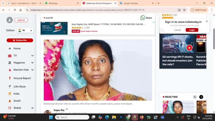 കൽബുർഗി: കർണാടകത്തിലെ കൽബുർഗി ജില്ലയിലെ ‘അറിവ് കേന്ദ്ര’ (വിജ്ഞാന കേന്ദ്രം) യിൽ വനിതാ ലൈബ്രേറിയൻ (40) ആത്മഹത്യ ചെയ്തു. മൂന്ന് മാസമായി ശമ്പളം ലഭിക്കാത്തതിനെ തുടർന്നാണ് അവർ ഈ കടുത്ത നടപടി സ്വീകരിച്ചതെന്ന് റിപ്പോർട്ടുണ്ട്.