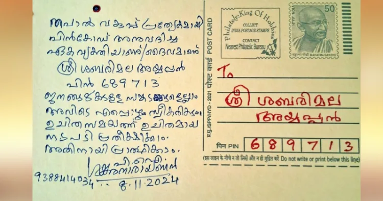 തപാല്‍ വകുപ്പിന്റെ പ്രത്യേക പിന്‍കോഡ് ലഭിച്ച ഭാരതത്തിലെ ഏക ക്ഷേത്രമാണ് ശബരിമല. ശ്രീ ശബരിമല അയ്യപ്പന്റെ പിന്‍കോഡ് 689713 ആണ്. സന്നിധാനത്തേക്ക് നേരിട്ടെത്താന്‍ കഴിയാത്ത ഭക്തര്‍ കത്തിലൂടെ തങ്ങളുടെ ആഗ്രഹസാഫല്യത്തിന് അയ്യപ്പനോട് അപേക്ഷിക്കാറുണ്ട്. അതില്‍ ചിലതെല്ലാം സഫലമാകാറുമുണ്ട്.