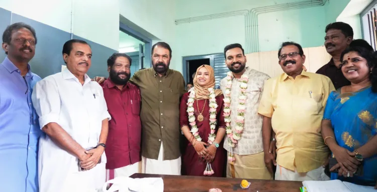 തിരുവനന്തപുരം സബ് രജിസ്ട്രാര് ഓഫീസില് നടന്ന ചടങ്ങില് വധു ഹിജാബ് ധരിച്ചാണ് എത്തിയത്. പാര്ട്ടി നേതാക്കളും മന്ത്രി ശിവന്കുട്ടിയും സാന്നിധ്യത്തിലുണ്ടായിരുന്ന ചടങ്ങ്, ഇടതുപക്ഷം പൊതു വേദികളില് സ്വീകരിച്ചിട്ടുള്ള മതചിഹ്നവിരുദ്ധ നിലപാടുകളുമായി താരതമ്യം ചെയ്യുമ്പോള് പ്രകടമായ അന്തര്വിരോധം വെളിവാക്കുകയാണ്.