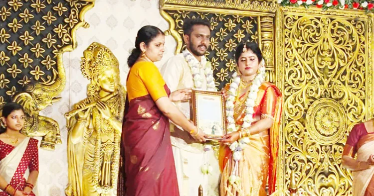ഇതോടൊപ്പം സേവാഭാരതി, സക്ഷമ എന്നീ സംഘടനകള്ക്കുള്ള മംഗളനിധിയും വധൂവരന്മാര് കൈമാറി. ശരതിന്റെ അമ്മ ചിത്ര സജി തലപ്പലം ഗ്രാമപഞ്ചായത്ത് ബിജെപി അംഗമാണ്.