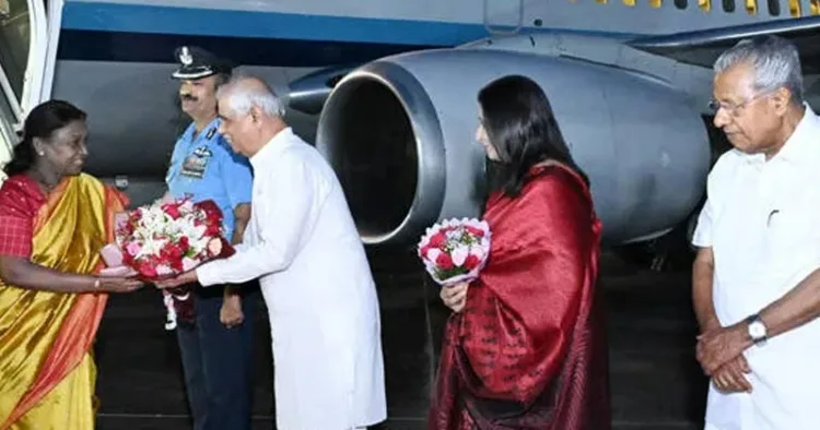 രാഷ്ട്രപതിയെ ഗവര്ണര് രാജേന്ദ്ര വിശ്വനാഥ് ആര്ലേക്കര്, മുഖ്യമന്ത്രി പിണറായി വിജയന്, ദേവസ്വം മന്ത്രി വി.എന്.വാസവന് തുടങ്ങിയവര് ചേര്ന്ന് സ്വീകരിച്ചു.രാജ് ഭവനിലെ പ്രസിഡന്ഷ്യല് സ്യൂട്ടിലാണ് രാഷ്ട്രപതി താമസിക്കുന്നത്.