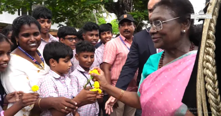 തിരുവനന്തപുരം: വർക്കല ശിവഗിരി മഠത്തിലേക്കുള്ള യാത്രാമധ്യേ, വഴിയിൽ പൂക്കളുമായി തന്നെ സ്വീകരിക്കാൻ കാത്തുനിന്ന വിദ്യാർത്ഥികൾക്ക് അരികിലെത്ത് രാഷ്ട്രപതി ദ്രൗപതി മുർമു. സ്കൂൾ വളപ്പിൽ അവർ നട്ടുവളർത്തിയ ചെടികളിലെ പൂക്കൾ രാഷ്ട്രപതിക്ക് അവർ കൈമാറി.