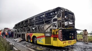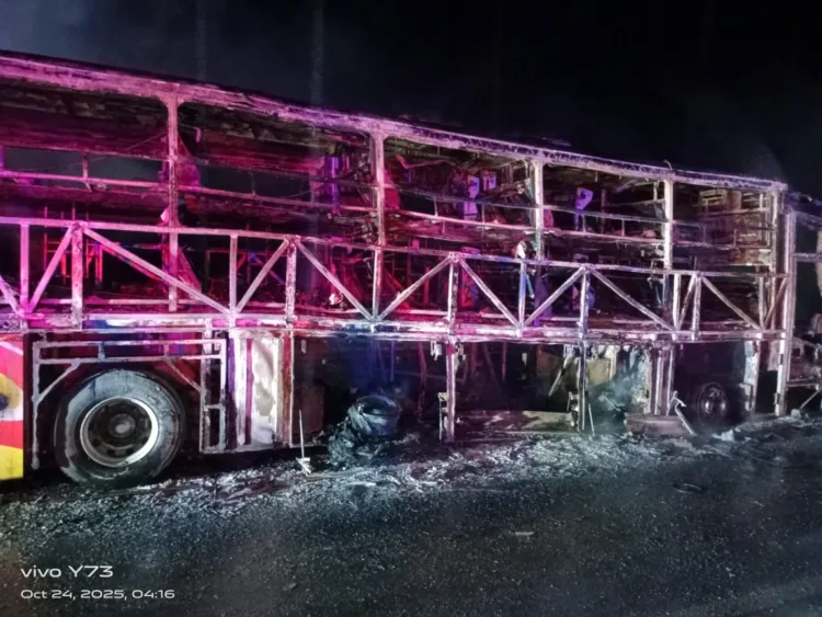 അമരാവതി: ആന്ധ്രപ്രദേശിലെ കർണൂൽ ജില്ലയിലെ ചിന്ന തെകുരു ഗ്രാമത്തിൽ ഇന്ന് പുലർച്ചെ കാവേരി ട്രാവൽസിന്റെ സ്വകാര്യ ബസ് തീപ്പിടിച്ച് 32 പേർ മരിച്ചതായി സംശയിക്കുന്നു. ഇതുവരെ 11 മൃതദേഹങ്ങൾ കത്തിക്കരിഞ്ഞ വാഹനത്തിൽ നിന്ന് കണ്ടെടുത്തു. 40 ൽ ഏറെ യാത്രക്കാരുമായി ഹൈദരാബാദിൽ നിന്ന് ബെംഗളൂരുവിലേക്ക് പോവുകയായിരുന്ന ബസ്, ബൈക്കുമായി തമ്മിലിടിച്ചാണ് അപകടം ഉണ്ടായത്. നിമിഷങ്ങൾക്കുള്ളിൽ കത്തിനശിച്ചു. ഇരുചക്രവാഹനവുമായി ഇടിച്ചുതെറിച്ചതിനെത്തുടർന്ന് ബസിനു തീപിടിക്കുകയായിരുന്നു. ഇരുചക്രവാഹനം ബസിന്റെ അടിയിൽ കുടുങ്ങി വലിഞ്ഞതോടെ തീ വേഗത്തിൽ പടർന്നു.