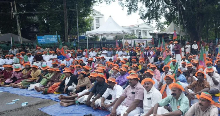 തിരുവനന്തപുരം: അനന്തപുരിയില് അലകടലായി ബിജെപി പ്രതിഷേധം. അയ്യപ്പസ്വാമിയുടെ സ്വര്ണം കവര്ന്ന പിണറായി സര്ക്കാരിനെതിരെ ആളിപ്പടരുന്ന സമരവീര്യം. കോരിച്ചൊരിയുന്ന മഴയ്ക്കും അണക്കാനാവാത്ത സമരാഗ്നി. കാര്മേഘങ്ങള് തുള്ളിക്കൊരുകുടമായി പെയ്തിറങ്ങുമ്പോഴും സെക്രട്ടറിയേറ്റിന് മുന്നിലേക്ക് ബിജെപി പ്രവര്ത്തകരുടെ നിലയ്ക്കാത്ത പ്രവാഹം.