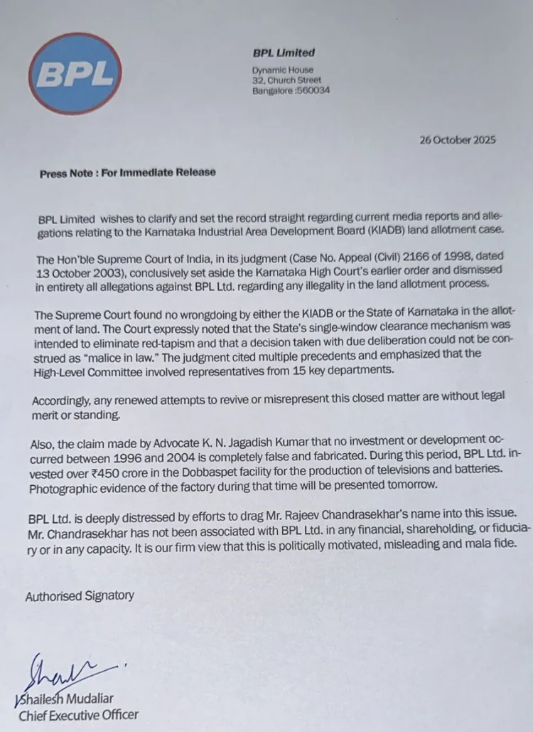 ഭൂമി അനുവദിച്ചതു സംബന്ധിച്ച കേസിൽ കർണാടക ഹൈക്കോടതിയുടെ വിധിയെ, അതിൽ ബിപിഎൽ ലിമിറ്റഡിന് ബന്ധമില്ലെന്ന് കണ്ടെത്തി 2023ൽ സുപ്രീം കോടതി റദ്ദാക്കിയിട്ടുള്ളതാണ്. ഭൂമി അനുവദിച്ചതിൽ ക്രമക്കേടില്ലെന്നായിരുന്നു സുപ്രീം കോടതിവിധി.