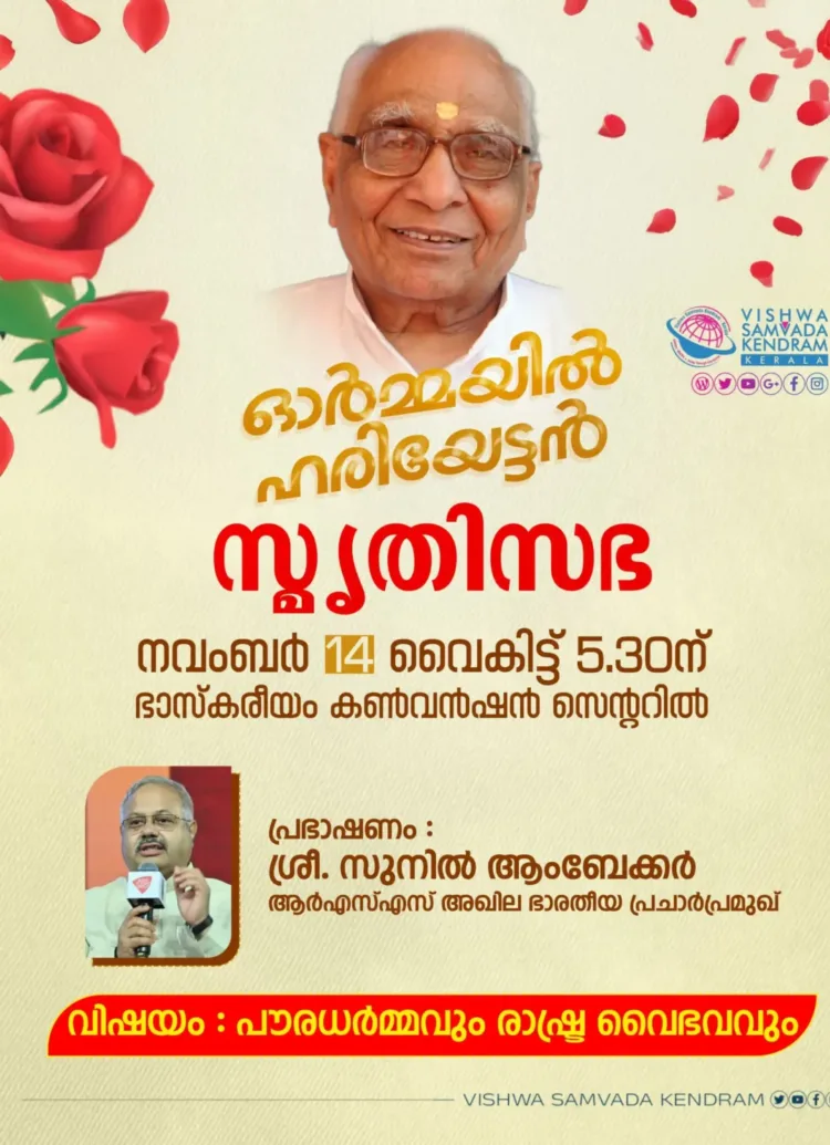 തിരുവനന്തപുരം: രാഷ്ട്രീയ സ്വയംസേവക സംഘത്തിന്റെ (ആർഎസ്എസ്) അഖിലേന്ത്യാ തലത്തിലുള്ള പ്രമുഖ ഭാരവാഹിത്വം ആദ്യം വഹിച്ച, ഹരിയേട്ടൻ എന്ന് അറിയപ്പെട്ടിരുന്ന ആർ. ഹരിയുടെ രണ്ടാമത് ചരമവാർഷിക ദിനമാണിന്ന്. നവംബർ 14ന് ആർഎസ്എസ് അഖില ഭാരതീയ പ്രചാർ പ്രമുഖ് സുനിൽ ആംബേക്കർ മുഖ്യപ്രഭാഷണം നടത്തുന്ന സ്മൃതി സഭ എണറാകുളം ഭാസ്കരീയം കൺവൻഷൻ സെന്ററിൽ നടക്കും. വൈകിട്ട് 5.30 നാണ് പരിപാടി. ചിന്തകൻ, പ്രഭാഷകൻ, എഴുത്തുകാരൻ, സംഘാടകൻ എന്നിങ്ങനെ വിശേഷങ്ങൾ ഏറെയുള്ള രംഗഹരിയുടെ ആർഎസ്എസ് പ്രവർത്തന കാലം സുദീർഘമാണ്. മഹാരാജസ് കോളെജിൽ ഡിഗ്രി വിദ്യാർത്ഥിയായിരിക്കെ സംഘപ്രവർത്തനത്തിൽ പങ്കാളിയായി ജീവിതത്തിന്റെ അവാസന നാളുവരെ കേരളത്തിൽ പ്രാദേശിക തലം മുതൽ സംസ്ഥാനതലയത്തിലും ദേശീയ തലത്തിലും പ്രവർത്തിച്ച് എല്ലാവർക്കും ‘ഹരിയേട്ട’നായി മാറിയ അദ്ദേം 2023 ഒക്ടോബർ 29 നാണ് 93 ാം വയസ്സിൽ അന്തരിച്ചത്.