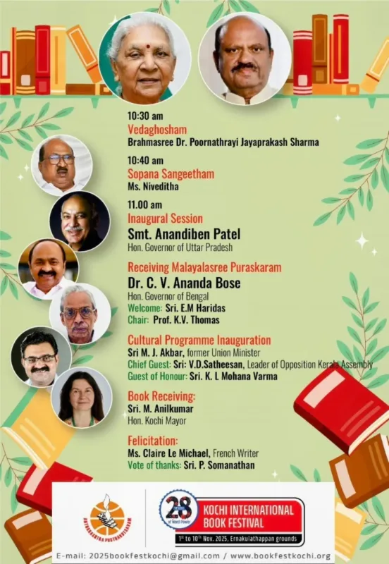 മലയാള രത്നപുരസ്കാരം ബംഗാൾ ഗവർണർ ഡോ. സി. വി. ആനന്ദബോസിന്ഉത്തരപ്രദേശ് ഗവർണർ ആനന്ദി ബെൻ പട്ടേൽ നൽകും. സാംസ്കാരിക പരിപാടിയുടെ ഉദ്ഘാടനവും ഡോ. സി.വി. ആനന്ദ ബോസിന്റെ 14 പുസ്തകങ്ങളുടെ പ്രകാശനവും മുൻ കേന്ദ്രമന്ത്രി എം. ജെ. അക്ബർ നിർവഹിക്കും. പ്രതിപക്ഷ നേതാവ് വി. ഡി. സതീശൻ മുഖ്യാതിഥിയാകും. കൊച്ചി മേയർ എം. അനിൽകുമാർ പുസ്തകങ്ങൾ ഏറ്റുവാങ്ങും.കെ. എൽ. മോഹനവർമ്മ പുസ്തകോത്സവ സന്ദേശം നൽകും. ഫ്രഞ്ച് സാഹിത്യകാരി ക്ലാരെ ലെ മൈക്കൾ പ്രഭാഷണം നടത്തും. ഇ. എം. ഹരിദാസ്, പി. സോമനാഥൻ എന്നിവർ പങ്കെടുക്കും.