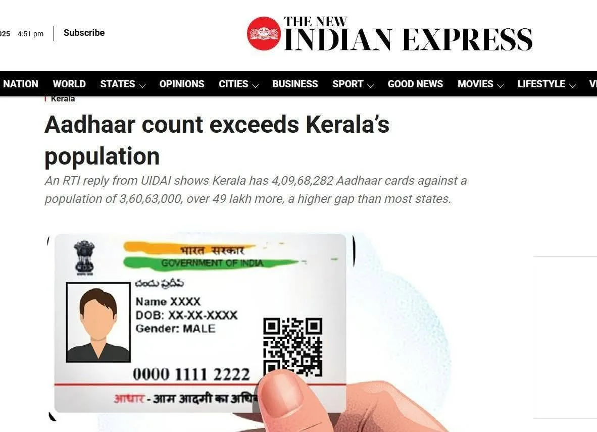 ആധാറിന്റെ അടിസ്ഥാനത്തിൽ വ്യാപകമായി വോട്ടർ പട്ടികയിൽ അനർഹർ കടന്നു കൂടിയെന്നും ബുധനാഴ്ച്ച കേരളത്തിൽ ആരംഭിക്കുന്ന എസ് ഐ ആർ ഏറെ അനിവാര്യമായ പ്രക്രിയയാണെന്നും അദ്ദേഹം ചൂണ്ടിക്കാട്ടി.കേരളത്തിൽ ജനസംഖ്യയെക്കാൾ അധികമായി 49 ലക്ഷത്തിലേറെ ആധാർ കാർഡുകളുണ്ടെന്നാണ് ദേശീയ മാധ്യമങ്ങളടക്കം റിപ്പോർട്ട് ചെയ്യുന്നത്. കേരളത്തിലെ ജനസംഖ്യ 3.60 കോടിയാണ്. എന്നാൽ കേരളത്തിൽ വിതരണം ചെയ്തിരിക്കുന്ന ആധാർ കാർഡുകളുടെ എണ്ണം 4.10 കോടിയും. ഇത് ഏറെ ആശങ്കയുളവാക്കുന്ന വെളിപ്പെടുത്തലാണ്.
