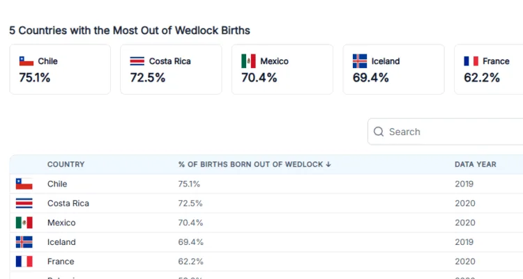 ചില രാജ്യങ്ങളിൽ അവിവാഹിത ജനനങ്ങളുടെ എണ്ണം കൂടുതലാണ. 2019 മുതൽ 2020 വരെ ചിലിയും കോസ്റ്റാറിക്കയുമാണ് ഈ പട്ടികയിൽ മുന്നിൽ, യഥാക്രമം 75.1% ഉം 72.5% ഉം കുട്ടികൾ ജനിച്ചു. മൊത്തത്തിൽ, 2019 – 2020 ലെ ഒഇസിഡി (ഓർഗനൈസേഷൻ ഫോർ ഇക്കണോമിക് കോ-ഓപ്പറേഷൻ ആൻഡ് ഡവലപ്മെന്റ്) ഡാറ്റ പ്രകാരം, മൊത്തം 15 രാജ്യങ്ങളിൽ അവിവാഹിത ജനനങ്ങളുടെ ശതമാനം 50% കവിയുന്നുണ്ട്.