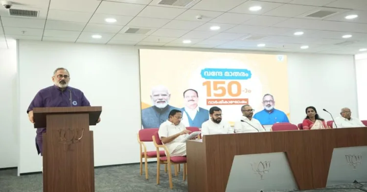 തിരുവനന്തപുരം: വന്ദേമാതരം ഗീതത്തിന്റെ 150-ാം വാര്‍ഷികാഘോഷങ്ങള്‍ക്ക് തുടക്കമായി. തിരുവനന്തപുരത്ത് ബിജെപി ആസ്ഥാനമായ മാരാര്‍ജി ഭവനില്‍ നടന്ന ചടങ്ങില്‍ ബിജെപി അധ്യക്ഷന്‍ രാജീവ് ചന്ദ്രശേഖര്‍ ഉദ്ഘാടനം ചെയ്തു.