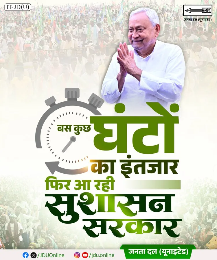 “കാത്തിരിക്കാൻ കുറച്ച് മണിക്കൂറുകൾ മാത്രം, നല്ല ഭരണത്തിന്റെ സർക്കാർ വീണ്ടും വരുന്നു.” -ജെഡിയു എക്സിൽ പോസ്റ്റ് ചെയ്തു. എക്സിറ്റ് പോളുകൾ നിതീഷ് കുമാറിന്റെ നേതൃത്വത്തിലുള്ള എൻഡിഎ സർക്കാരിന്റെ തിരിച്ചുവരവ് പ്രവചിച്ചിട്ടുണ്ട്. ഇത് എൻഡിഎ ക്യാമ്പിനുള്ളിൽ ആവേശം സൃഷ്ടിച്ചു.