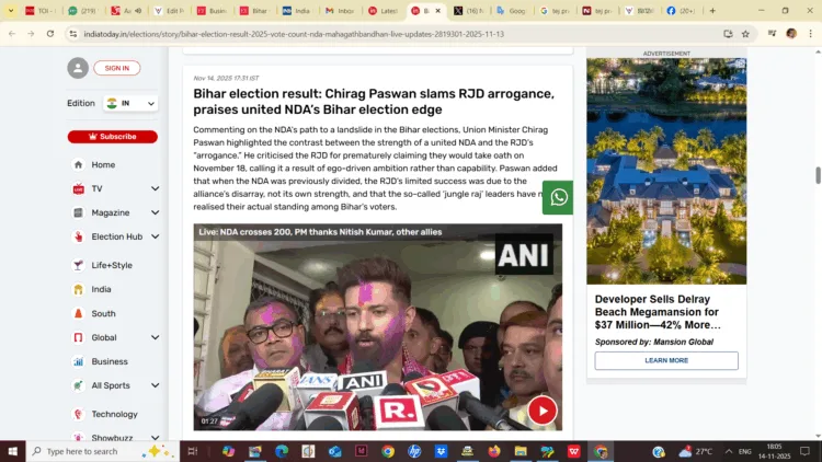 പാറ്റ്ന: ബീഹാർ തെരഞ്ഞെടുപ്പ് ഫലം വന്നപ്പോൾ ആർജെഡിയുടെ ഗതിയും സ്ഥിതിയും വിവരിച്ച് ചിരാഗ് പാസ്വാൻ. തെരഞ്ഞെടുപ്പിൽ വാശിയും ആവേശവും ആത്മവിശ്വാസവും ആകാം. പക്ഷേ, ഇത്ര അഹങ്കാരം പാടില്ല. ആർജെഡിയുടെ ധാർഷ്ട്യത്തെ വിമർശിച്ചും എൻഡിഎയുടെ പ്രത്യേകതകളെയും പരാമർശിച്ച് ചിരാഗ് പാസ്വാൻ ഇങ്ങനെ പ്രതികരിച്ചു. ”ഐക്യ എൻഡിഎയുടെ ശക്തിയും ആർജെഡിയുടെ ‘അഹങ്കാരവും’ തമ്മിലുള്ള വ്യത്യാസം കാണണം. നവംബർ 18 ന് സത്യപ്രതിജ്ഞ ചെയ്യുമെന്ന് അകാലത്തിൽ, അസ്ഥാനത്ത് അവകാശം പറയുകയായിരുന്നു ആർജെഡി. കഴിവിനേക്കാൾ അഹങ്കാരത്താൽ നയിക്കപ്പെടുന്ന അഭിലാഷത്തിന്റെ ഫലമാണിത്. എൻഡിഎ മുമ്പ് സംസ്ഥാനത്ത് ഇത്രത്തോളം യോജിപ്പില്ലാഞ്ഞ കാലത്ത് ആർജെഡി കഷ്ടിച്ച് വിജയിക്കുകയായിരുന്നു. ആ പരിമിതമായ വിജയം എതിർപക്ഷ സഖ്യത്തിന്റെ കുഴപ്പം മൂലമാണെന്നും സ്വന്തം ശക്തിയല്ലെന്നും ‘ജംഗിൾ രാജ്’ നേതാക്കൾ ഇപ്പോൾ തിരിച്ചറിയുന്നുണ്ടാകും. ബീഹാറിലെ വോട്ടർമാർക്കിടയിൽ അവരുടെ യഥാർത്ഥ സ്ഥാനം തിരിച്ചറിഞ്ഞിട്ടുണ്ടാവും പാസ്വാൻ പറഞ്ഞു.