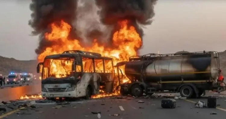 ഇടിയുടെ ആഘാതത്തില് ബസ് പൂര്ണ്ണമായും കത്തുകയും 42 തീര്ത്ഥാടകര് സംഭവസ്ഥലത്ത് വെച്ച് തന്നെ മരണപ്പെടുകയും ചെയ്തിരുന്നു. മരണപെട്ട 42 പേരില് 20 പേര് സ്ത്രീകളും 11 പേര് കുട്ടികളുമാണെന്നാണ് പ്രാഥമിക വിവരം. ബസില് 43 യാത്രക്കാര് ഉണ്ടായിരുന്നത് ഇവരില് ഒരാള് മാത്രമാണ് രക്ഷപ്പെട്ടത്.