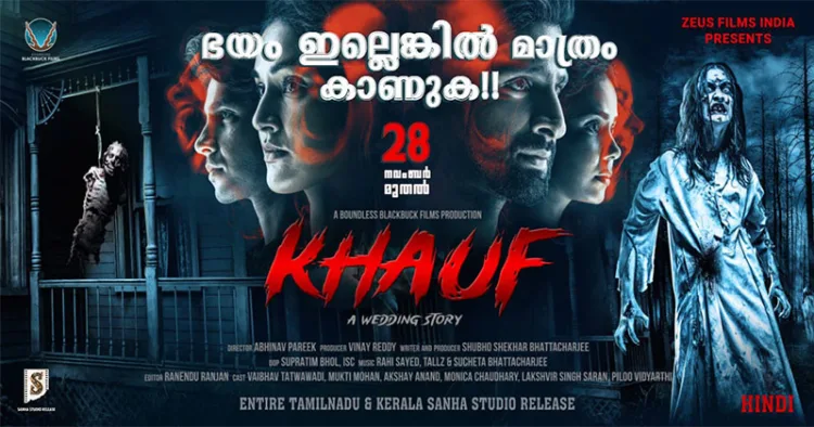 ഓരോ നിമിഷവും ഭയം നിറയ്ക്കുന്ന ദൃശ്യങ്ങളും ശബ്ദ വിന്യാസവുമായി ”ഖാഫ് – എ വെഡ്ഡിംഗ് സ്റ്റോറി” സിനിമ കേരളത്തിൽ റിലീസിന് എത്തുന്നു. സൂപ്പർ നാച്ചുറൽ ഹൊറർ ത്രില്ലറായ ചിത്രം നവംബർ 28ന് ആണ് തിയേറ്ററുകളിൽ എത്താനിരിക്കുന്നത്. ബൗണ്ട്ലസ് ബ്ലാക്ക്ബക്ക് ഫിലിംസിന്റെ ബാനറിൽ ശുഭോ ശേഖർ ഭട്ടാചാര്യ രചനയും നിർമ്മാണവും വഹിച്ച് അഭിനവ് പരീഖ് സംവിധാനം ചെയ്ത ചിത്രം ഓഗസ്റ്റിൽ ഹിന്ദിയിൽ റിലീസ് ചെയ്തിരുന്നു. ഒരു കുടുംബത്തിലെ വൃദ്ധൻ അസാധാരണമായി മരണപ്പെടുന്നതും, തുടർന്ന് അത് കുടുംബത്തിൽ നടക്കുന്ന കല്യാണത്തിന് ഭീതി വിതയ്ക്കുന്ന സംഭവങ്ങളും അതിന് പിന്നിലെ കാരണങ്ങളുമൊക്കെയാണ് ചിത്രം ചർച്ചചെയ്യുന്നത്.