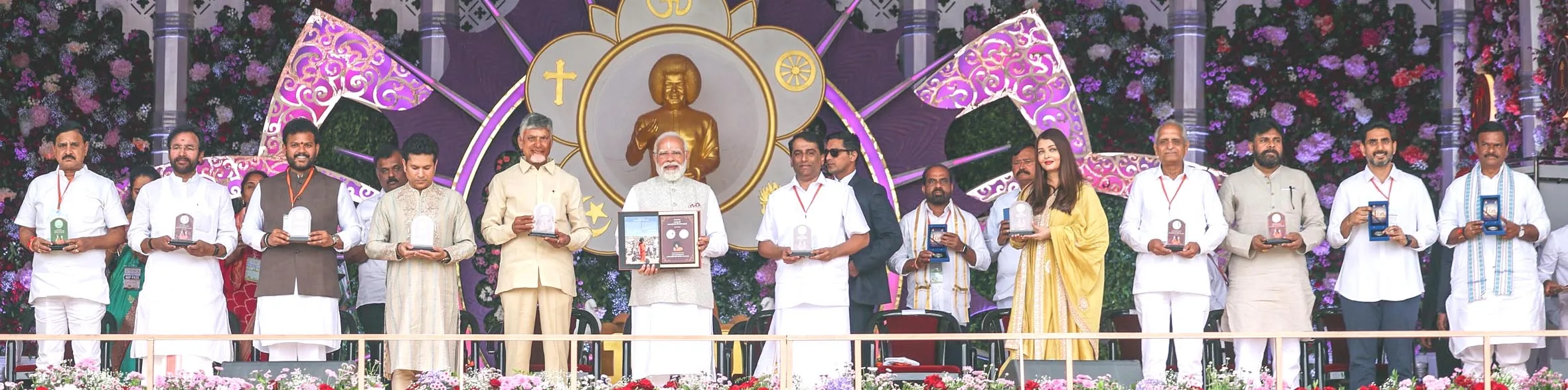 ശ്രീ സത്യസായി ബാബയുടെ ജന്മശതാബ്ദി ആഘോഷങ്ങളുടെ ഭാഗമായി ഇന്നലെ പുട്ടപര്‍ത്തിയില്‍ പ്രധാനമന്ത്രി നരേന്ദ്ര മോദി അദ്ദേഹത്തിന്റെ സ്മാരക നാണയം പ്രകാശനം ചെയ്യുന്നു. കേന്ദ്രമന്ത്രി റാം മോഹന്‍ നായിഡു, മുന്‍ ഭാരത ക്രിക്കറ്റ് താരം സച്ചിന്‍ ടെണ്ടുല്‍ക്കര്‍, ആന്ധ്രാപ്രദേശ് മുഖ്യമന്ത്രി എന്‍. ചന്ദ്രബാബു നായിഡു, ബോളിവുഡ് നടി ഐശ്വര്യ റായ് ബച്ചന്‍, ആന്ധ്ര ഉപമുഖ്യമന്ത്രി പവന്‍ കല്യാണ്‍ തുടങ്ങിയവര്‍ സമീപം