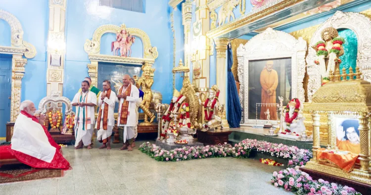 പുട്ടപര്‍ത്തി വിമാനത്താവളത്തിലെത്തിയ പ്രധാനമന്ത്രിയെ ആന്ധ്രാപ്രദേശ് മുഖ്യമന്ത്രി എന്‍. ചന്ദ്രബാബു നായിഡു, ഉപമുഖ്യമന്ത്രി പവന്‍ കല്യാണ്‍, മാനവ വിഭവശേഷി മന്ത്രി നര ലോകേഷ്, ശ്രീസത്യസായി സെന്‍ട്രല്‍ ട്രസ്റ്റ് മാനേജിങ് ട്രസ്റ്റി ആര്‍.ജെ. രത്നാകര്‍ എന്നിവര്‍ ചേര്‍ന്ന് സ്വീകരിച്ചു. തുടര്‍ന്ന് പ്രധാനമന്ത്രി മോദി പ്രശാന്തിനിലയത്തിലെത്തി ശ്രീസത്യസായി ബാബയുടെ മഹാസമാധിയില്‍ പ്രാര്‍ത്ഥന നടത്തി. പുരോഹിതരുടെ വേദ ശ്ലോക ആലാപനത്തിനിടയില്‍ അദ്ദേഹം ശ്രീസത്യസായി ബാബയുടെ സ്വര്‍ണ പ്രതിമയില്‍ പ്രത്യേക പൂജകള്‍ നടത്തുകയും അല്‍പ നേരം ധ്യാനിക്കുകയും ചെയ്തു.