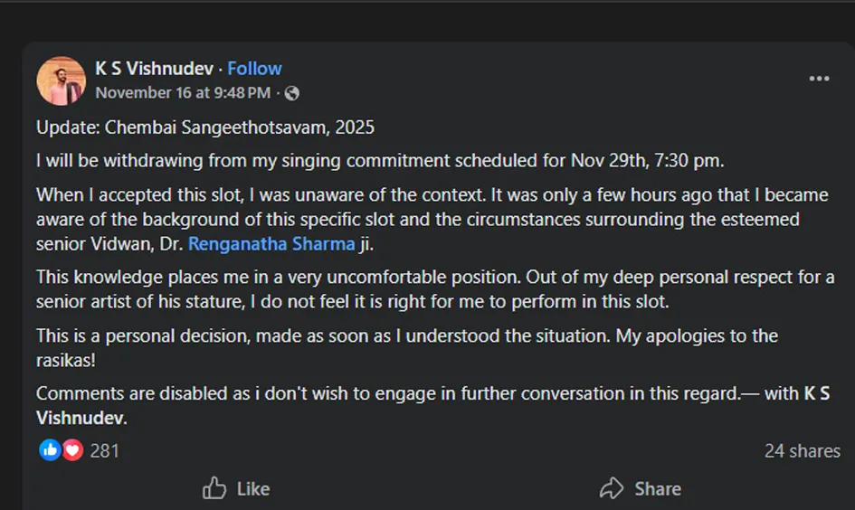രംഗനാഥ ശര്‍മ്മയ്‌ക്ക് പകരം നവംബര്‍ 29ന് കച്ചേരി അവതരിപ്പിക്കാന്‍ കെ.എസ്. വിഷ്ണു ദേവിനോട് ദേവസ്വം ആവശ്യപ്പെട്ടെങ്കിലും അദ്ദേഹവും പിന്മാറി. രംഗനാഥ ശര്‍മയെ ഒഴിവാക്കിയാണ് തന്നെ കച്ചേരിക്ക് ക്ഷണിച്ചതെന്ന് ആദ്യം അറിയില്ലായിരുന്നുവെന്നും അത്തരമൊരു സാഹചര്യത്തില്‍ കച്ചേരി അവതരിപ്പിക്കാന്‍ താല്പര്യമില്ലെന്നും വിഷ്ണുദേവ് ഫെയ്‌സ്ബുക്ക് പോസ്റ്റില്‍ കുറിച്ചു. ചെമ്പൈ സംഗീതോത്സവത്തില്‍ പാടാനുള്ള ക്ഷണം ആദ്യം ആഹ്ലാദത്തോടെയാണ് സ്വീകരിച്ചത്. എന്നാല്‍ രംഗനാഥ ശര്‍മയെ പോലെ ആചാര്യസ്ഥാനത്തുള്ള സംഗീതജ്ഞരോട് സ്വീകരിക്കേണ്ട പെരുമാറ്റ രീതി ഇതല്ല. ഗുരു സ്ഥാനീയരായ സംഗീതജ്ഞരോട് ഇത്തരം നിലപാട് സ്വീകരിക്കുന്നതിനാല്‍ 29-ന് നടക്കേണ്ട കച്ചേരിയില്‍ നിന്ന് പിന്മാറുകയാണ് വിഷ്ണുദേവ് കുറിച്ചു. സംഗീതാസ്വാദകരോട് മാപ്പു ചോദിക്കുന്നതായും അദ്ദേഹം പറഞ്ഞു. ഇക്കാര്യത്തില്‍ കൂടുതല്‍ ചര്‍ച്ചയ്‌ക്ക് താല്പര്യമില്ലെന്നാണ് അദ്ദേഹത്തിന്റെ നിലപാട്.