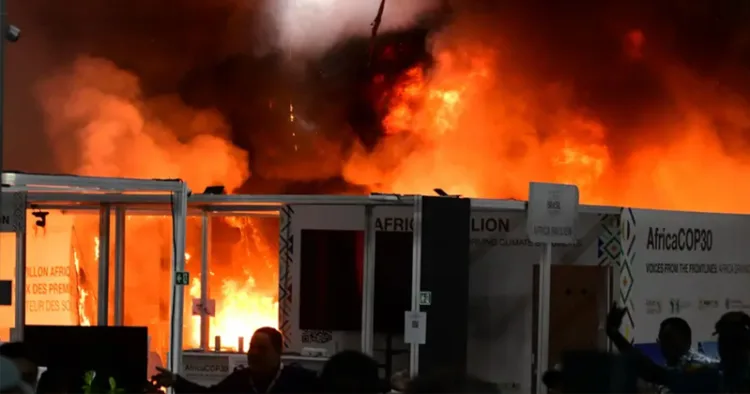 പ്രധാന പ്ലീനറി ഹാൾ ഉൾപ്പെടെ എല്ലാ മീറ്റിംഗുകളും ചർച്ചകളും കൺട്രി പവലിയനുകളും മീഡിയ സെന്റർ, ഉന്നത വ്യക്തികളുടെ ഓഫീസുകൾ എന്നിവ സ്ഥിതി ചെയ്യുന്ന ഇടമാണ് ബ്ലൂ സോൺ. തീപിടിത്തമുണ്ടായി ഉടൻ തന്നെ യുഎൻ സെക്രട്ടറി ജനറൽ അന്റോണിയോ ഗുട്ടെറസ് ഉൾപ്പെടെയുള്ളവരെ വേദിയിൽ നിന്ന് മാറ്റി. കേന്ദ്ര പരിസ്ഥിതി മന്ത്രി ഭൂപേന്ദർ യാദവും വേദിയിലുണ്ടായിരുന്നു ഈ മാസം 10ന് ആരംഭിച്ച ഉച്ചകോടി വെള്ളിയാഴ്ച അവസാനിക്കാനിരിക്കെയാണ് തീപിടിത്തമുണ്ടായത്. ഇലക്ട്രിക്കൽ ഉപകരണത്തിൽ നിന്നാണ് തീ പടർന്നതെന്നാണ് പ്രാഥമിക വിലയിരുത്തൽ.