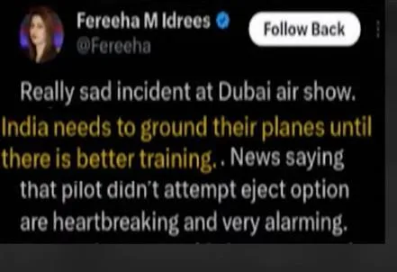 ഓപ്പറേഷന്‍ സിന്ദൂറിന്റെ നാണം മറയ്‌ക്കാന്‍ തേജസ് യുദ്ധവിമാനത്തകര്‍ച്ചയെ പരിഹസിച്ച് പാക് പ്രതിരോധമന്ത്രി; കൂട്ടിന് പാക് ജേണലിസ്റ്റ് ഫരീദ എം ഇദ്രീസും