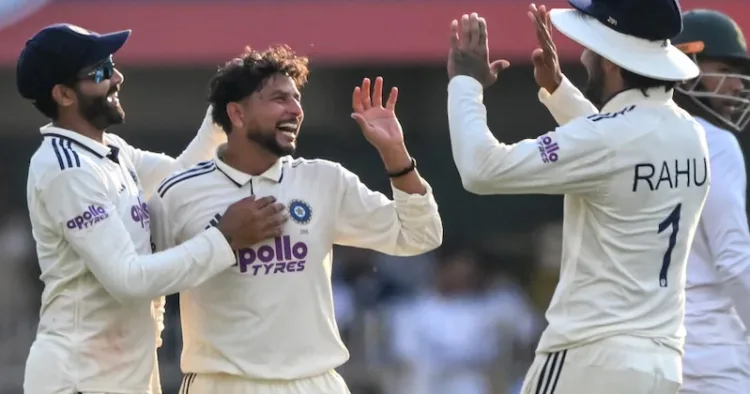 ഭാരത സ്പിന്നര്‍ രവീന്ദ്ര ജഡേജ സഹതാരങ്ങള്‍ക്കൊപ്പം ദക്ഷിണാഫ്രിക്കന്‍ വിക്കിറ്റ് വീഴ്ത്തിയത് ആഘോഷിക്കുന്നു