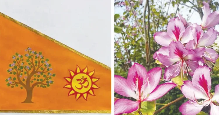 ദേവവൃക്ഷങ്ങളായ മന്ദാരവും പാരിജാതവും കൂടിച്ചേര്ന്ന കോവിദാരം അയോദ്ധ്യയുടെ തനിമയുടെ പ്രതീകമാണെന്ന് സര്സംഘചാലക് പറഞ്ഞു. ശ്രീരാമഭഗവാനെ കാണാന് സഹോദരന് ഭരതന് പടയുമായി കാട്ടിലെത്തുമ്പോള് അത് അയോദ്ധ്യയുടെ സേനയാണെന്ന് ലക്ഷ്മണന് ദൂരെ നിന്നേ തിരിച്ചറിയുന്നത് കോവിദാര വൃക്ഷം ആലേഖനം ചെയ്ത ഈ പതാക കണ്ടിട്ടാണെന്ന വാല്മീകി മഹര്ഷിയുടെ വാക്കുകള് ഉദ്ധരിച്ചാണ് തനിമയെക്കുറിച്ച് പ്രധാനമന്ത്രി ചൂണ്ടിക്കാട്ടിയത്. ഇതോടെ എല്ലാവരും കോവിദാരമരം എന്താണെന്ന അന്വേഷണത്തിലായി.
