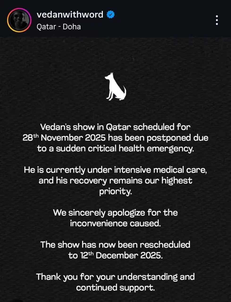 Summary: Rapper Vedan’s show in Qatar scheduled for 28 November 2025 has been postponed due to a sudden critical health emergency. Vedan is currently under intensive medical care. The show has now been rescheduled to 12th December 2025.