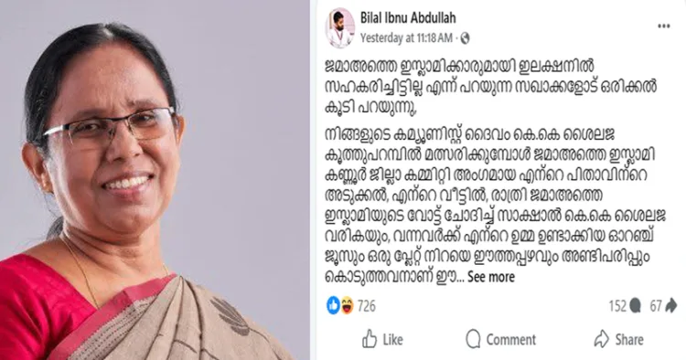‘ജമാ അത്തെ ഇസ്ലാമിക്കാരുമായി ഇലക്ഷനില് സഹകരിച്ചിട്ടില്ലെന്ന് പറയുന്ന സഖാക്കളോട് ഒരിക്കല് കൂടി പറയുന്നു, നിങ്ങളുടെ കമ്യൂണിസ്റ്റ് ദൈവം കെ.കെ. ശൈലജ കൂത്തുപറമ്പില് മത്സരിക്കുമ്പോള് ജമാ അത്തെ ഇസ്ലാമി കണ്ണൂര് ജില്ലാ കമ്മിറ്റി അംഗമായ എന്റെ പിതാവിന്റെ അടുക്കല്, എന്റെ വീട്ടില്, രാത്രി ജമാ അത്തെ ഇസ്ലാമിയുടെ വോട്ട് ചോദിച്ച് സാക്ഷാല് കെ.കെ. ശൈലജ വരികയും വന്നവര്ക്ക് എന്റെ ഉമ്മയുണ്ടാക്കിയ ഓറഞ്ച് ജൂസും ഒരു പ്ലേറ്റ് നിറയെ ഈന്തപ്പഴവും അണ്ടിപ്പരിപ്പും കൊടുത്തവനാണ് ഈ ഞാന്. ഉളുപ്പുണ്ടേല് ആ അണ്ടിപ്പരിപ്പിന്റെ പൈസ തിരിച്ചു താ’… ഈ പോസ്റ്റാണ് സാമൂഹ്യ മാധ്യമങ്ങളില് വിവാദമായത്.