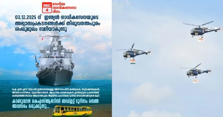 നാവികസേനാ ദിനമായ ഡിസംബർ 3ന് തിരുവനന്തപുരം ശംഖുമുഖത്ത് നടക്കുന്ന നാവികസേനയുടെ അഭ്യാസപ്രകടനങ്ങൾ കാണുവാൻ കെഎസ്ആർടിസി ബഡ്ജറ്റ് ടൂറിസം സെൽ അവസരമെരുക്കുന്നു