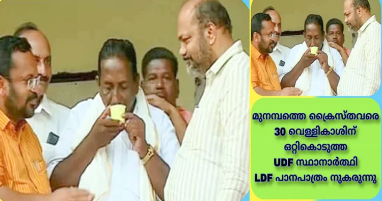 മന്ത്രിമാരായ പി. രാജീവില് നിന്നും കെ.രാജനില് നിന്നും നാരങ്ങാനീര് വാങ്ങി കുടിക്കുന്ന ചിത്രം സഹിതമാണ് പോസ്റ്റുകള് പ്രചരി ക്കുന്നത്.