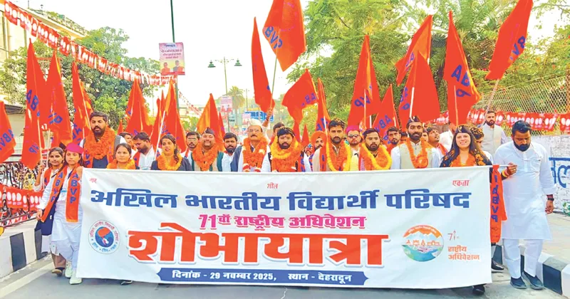 എബിവിപി 71-ാം ദേശീയ സമ്മേളനത്തിന്റെ ഭാഗമായി ഡെറാഡൂണില്‍ നടന്ന ശോഭായാത്ര. ദേശീയ പ്രസിഡന്റ് പ്രൊഫ. രഘുരാജ് കിഷോര്‍ തിവാരി, ദേശീയ ജനറല്‍ സെക്രട്ടറി ഡോ. വീരേന്ദ്രസിങ് സോളങ്കി, ദേശീയ സെക്രട്ടറിമാരായ ക്ഷമ ശര്‍മ്മ, ശാലിനി വര്‍മ്മ, ശ്രാവണ്‍ ബി. രാജ് എന്നിവര്‍ മുന്‍നിരയില്‍.