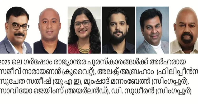 ബംഗളൂരു: ഗര്ഷോം ഫൗണ്ടേഷന്റെ 2025ലെ ഗര്ഷോം രാജ്യാന്തര പുരസ്കാരങ്ങള് പ്രഖ്യാപിച്ചു. സജ്ീവ്നാരായണന് (കുവൈറ്റ്),അലക്സ് അബ്രഹാം (ഫിലിപ്പീന്സ്), സുചേത സതീ്ഷ്(യു എ ഇ), മുംഷാദ് മന്നംബേത്ത്(സിംഗപ്പൂര്), സാവിയോ ജെയിംസ്( അയര്ലന്ഡ്), ഡി.
