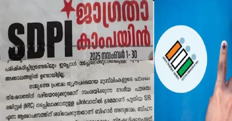എസ് ഐആര് ജാഗ്രതാ കാമ്പയിന് എന്ന പേരിലാണ് എസ് ഡിപിഐ കേരളത്തില് പ്രചാരണം നടത്തിയത്. ബീഹാറില് മുസ്ലിം സമുദായം എസ് ഐ ആറിന് എതിരെ പ്രവര്ത്തിച്ചതിനാല് അവര് എസ് ഐ ആര് പൂരിപ്പിച്ച് നല്കാത്തതിനാല് വോട്ടര്പട്ടികയില് നിന്നും പുറത്തായെന്നും അത്തരം അനുഭവം കേരളത്തില് ഉണ്ടാകരുതെന്നും ആണ് എസ് ഡിപി ഐ നോട്ടീസില് പറയുന്നത്. പക്ഷെ ഇത് കള്ളമാണ്. വാസ്തവത്തില് ബീഹാറില് പുറത്താക്കിയത് ഇരട്ടവോട്ടുള്ളവരെയും മരണപ്പെട്ടവരെയും പുറത്തെ രാജ്യങ്ങളില് നിന്നും വ്യാജരേഖകളിന്മേല് അവിടേക്ക് കുടിയേറിയവരെയും ആണ്. ഇതാണ് ബീഹാറിലെ വോട്ടര്പട്ടികയില് നിന്നും പുറത്തായ 60 ലക്ഷത്തോളം വരുന്ന വോട്ടര്മാര്.