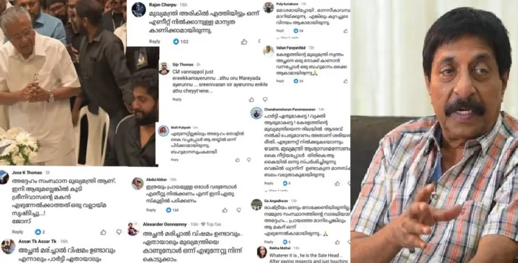 ‘ അദ്ദേഹം സംസ്ഥാന മുഖ്യമന്ത്രിയാണ് ശ്രീനിവാസന്റെ മകൻ എഴുന്നേൽക്കാത്തത വല്ലായ്‌മ സൃഷ്ടിച്ചു , അച്ഛൻ മരിച്ചതിൽ വിഷമം കാണും എന്നാലും മുഖ്യമന്ത്രിയെ ബഹുമാനിക്കണ്ടേ , ഇത്രയും പ്രായമുള്ള ആൾ അതും മുഖ്യമന്ത്രി വരുമ്പോൾ എഴുന്നേൽക്കണ്ടെ ‘ എന്നൊക്കെയാണ് കമന്റുകൾ.