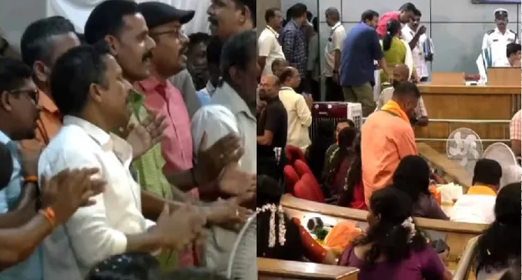 പ്രകടനമായാണ് ബിജെപി അംഗങ്ങൾ കോർപ്പറേഷൻ ഓഫിസിലെക്കെത്തിയത്. സത്യപ്രതിജ്ഞയ്ക്കു പിന്നാലെ ബിജെപി പ്രവർത്തകർ കോർപ്പറേഷൻ കൗൺസിൽ ഹാളിൽ ഗണഗീതം പാടി . ‘പരമപവിത്രം’ എന്ന് തുടങ്ങുന്ന ഗാനമാണ് ബിജെപി പ്രവർത്തകർ പാടിയത്.