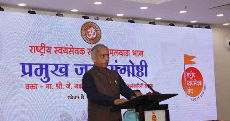 നാഗ്പൂര്‍: ശതാബ്ദികാലം ആഘോഷിക്കാനല്ല, ആത്മപരിശോധനയ്‌ക്കുള്ള അവസരമായാണ് ആര്‍എസ്എസ് കാണുന്നതെന്ന് പ്രജ്ഞാപ്രവാഹ് ദേശീയ സംയോജകന്‍ ജെ. നന്ദകുമാര്‍. പരമവൈഭവരാഷ്‌ട്രത്തിലൂടെ വിശ്വമംഗളമെന്ന ലക്ഷ്യത്തിലേക്ക് ഇനിയും ദൂരമുണ്ട്. അതിന് തുടര്‍ച്ചയായ പ്രവര്‍ത്തനം ആവശ്യമാണെന്ന് അദ്ദേഹം പറഞ്ഞു. ആര്‍എസ്എസ് ശതാബ്ദിയുടെ ഭാഗമായി സോമല്‍വാഡയില്‍ പൗരപ്രമുഖരുടെ സമ്മേളനത്തില്‍ സംസാരിക്കുകയായിരുന്നു നന്ദകുമാര്‍.