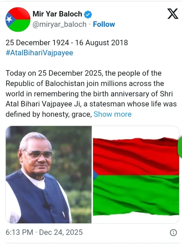 “ഇന്ന്, ഡിസംബർ 25, 2025, ബലൂചിസ്ഥാൻ റിപ്പബ്ലിക്കിലെ ജനങ്ങൾ അടൽ ബിഹാരി വാജ്പേയിയുടെ ജന്മദിനം ആഘോഷിക്കുന്നതിൽ ലോകമെമ്പാടുമുള്ള ദശലക്ഷക്കണക്കിന് ആളുകളോടൊപ്പം ചേരുന്നു. സത്യസന്ധത, മാന്യത, തന്റെ രാജ്യത്തോടുള്ള അചഞ്ചലമായ പ്രതിബദ്ധത എന്നിവയാൽ ജീവിതം നിർവചിക്കപ്പെട്ട ഒരു രാഷ്ട്രതന്ത്രജ്ഞനായിരുന്നു അദ്ദേഹം.” – മിർ യാർ കുറിച്ചു.