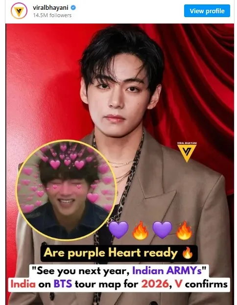 ഡിസംബർ 27-ന് നടന്ന തന്റെ വെവേഴ്സ് ലൈവ് സെഷനിൽ, ഗായകനും ഗാനരചയിതാവുമായ കിം താഹ്യുങ് ആരാധകരെ അഭിവാദ്യം ചെയ്യുകയും ‘ഭാരത സേനയ്‌ക്ക് നമസ്തേ, അടുത്ത വർഷം കാണാം’ എന്ന് പറയുകയും ചെയ്തിരുന്നതാണ്. ഇതിനപ്പുറം ടൂർ തീയതികളോ സ്ഥലമോ സംബന്ധിച്ച് ഒന്നും അദ്ദേഹം നേരിട്ട് സ്ഥിരീകരിച്ചിട്ടില്ല. അവരുടെ ഭാരത പര്യടനം ആസൂത്രണം ചെയ്‌തേക്കാമെന്ന സൂചനയായി സോഷ്യൽ മീഡിയ ഉപയോക്താക്കൾ ഇതിനെ പെട്ടെന്ന് വ്യാഖ്യാനിക്കുകയായിരുന്നു.